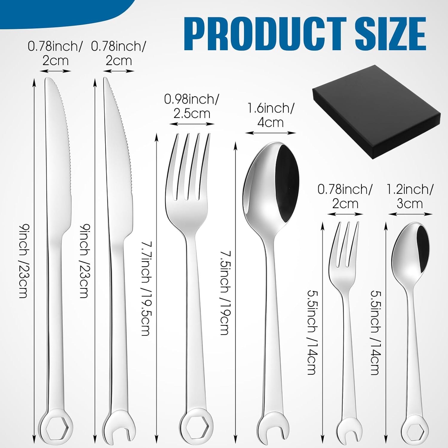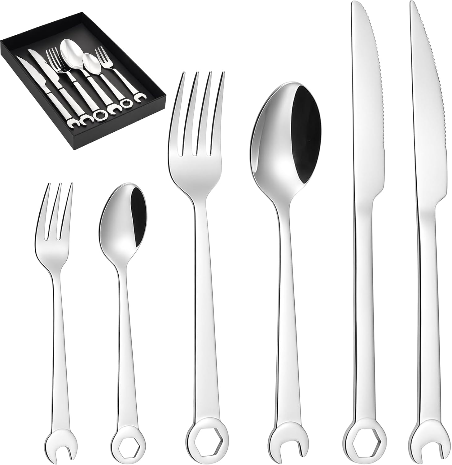 Honeydak 6 Pieces Silverware Tool Cutlery Set Stainless Steel Tableware Set Tool Fork, Knife and Spoon Gift Box Storage Housewarming Mechanic Gifts Wrench for Kitchen Utensil Camping Travel